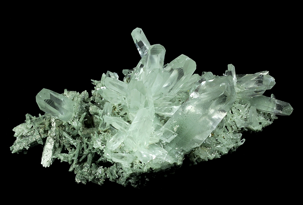 Gemmy Quartz crystals to 54 x 20 mm, with a slightly satiny luster, are perched on a base of green Chlorite(?)-included Quartz. One Quartz crystal has a small conchoidal chip near the termination, otherwise the specimen is in great shape. Purchased in 2014 for my personal collection.