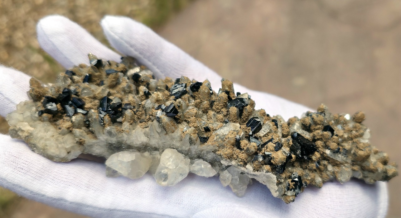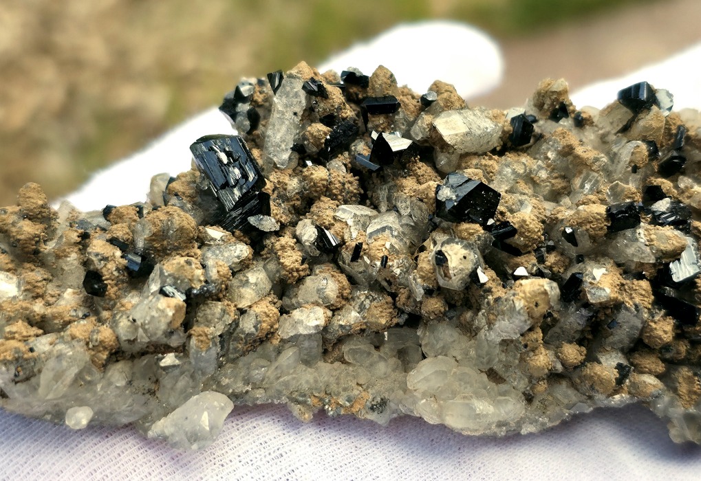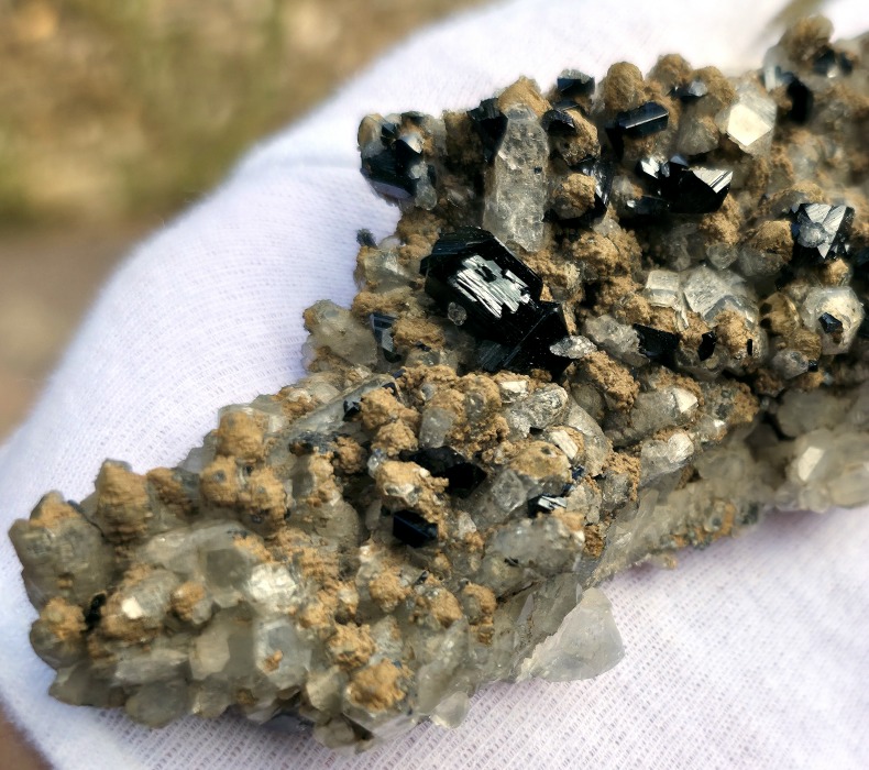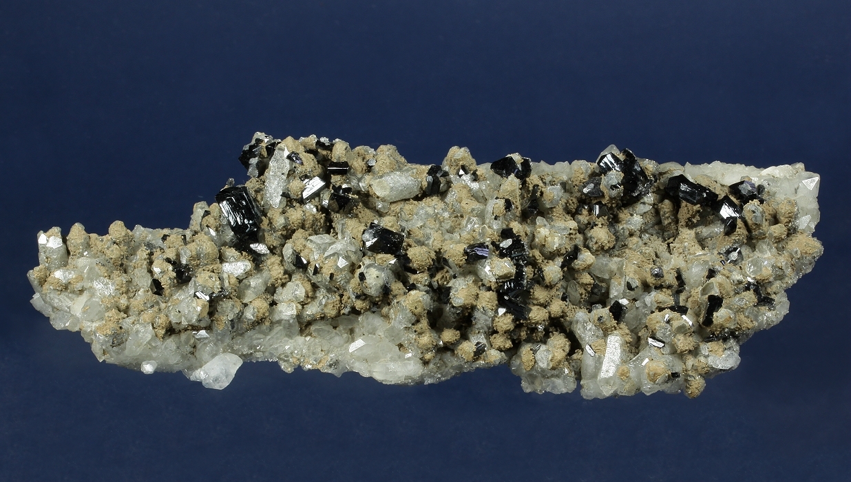 Highly lustrous, blocky, lustrous-black Ilvaite crystals to 10 x 5 mm, some doubly terminated, are nestled on a plate of clear Quartz crystals to 15 mm long. The Quartz is accented with tan crusts, and translucent, clear Calcite crystals to 16 mm are perched on the edge of the plate. This is a great combination specimen from this classic Russian locality. No damage.
