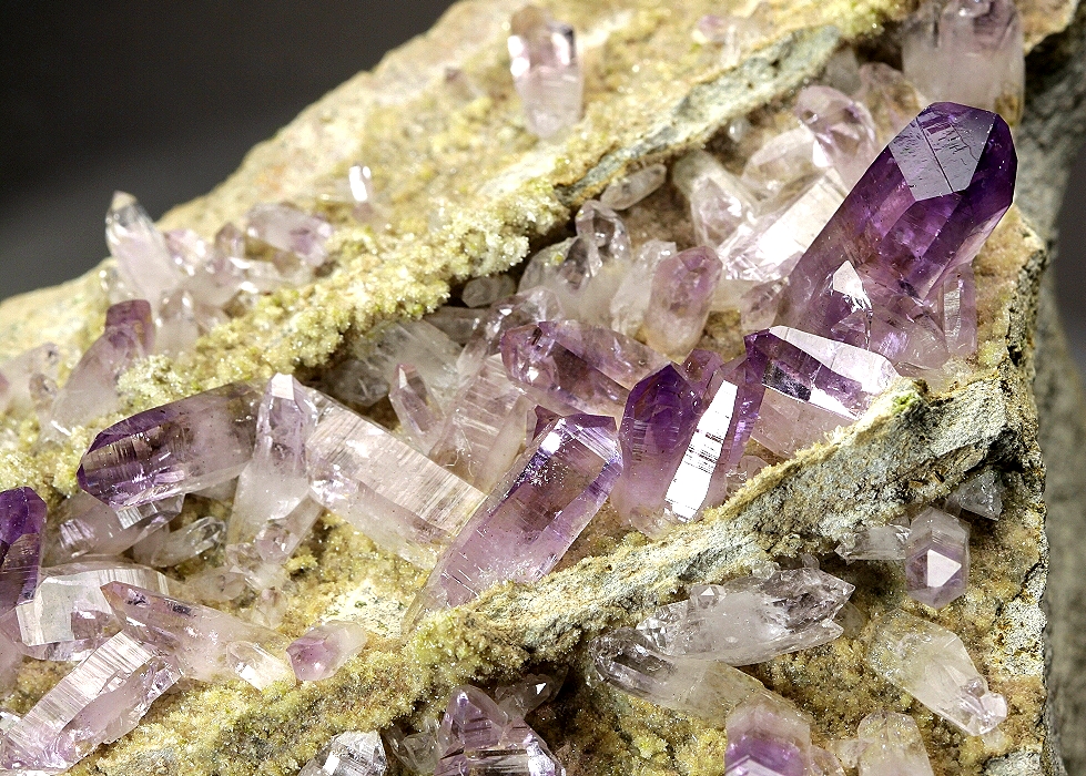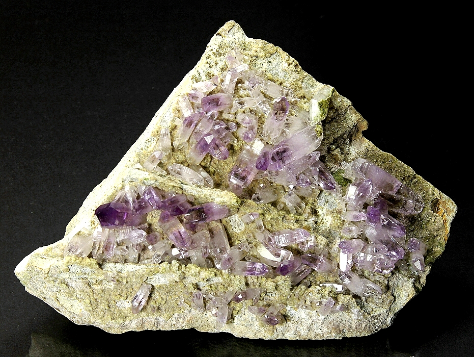 An unusual tan plate of matrix coated with sparkly microscopic crystals of clear Quartz and greenish Epidote generously covered with lusterous, very transparent, light-grape-colored Quartz cystals, many doubly terminated. Some clear Quartz crystals are also present. This fine old specimen dates to about the mid 1960s when this collection was assembled. No damage.